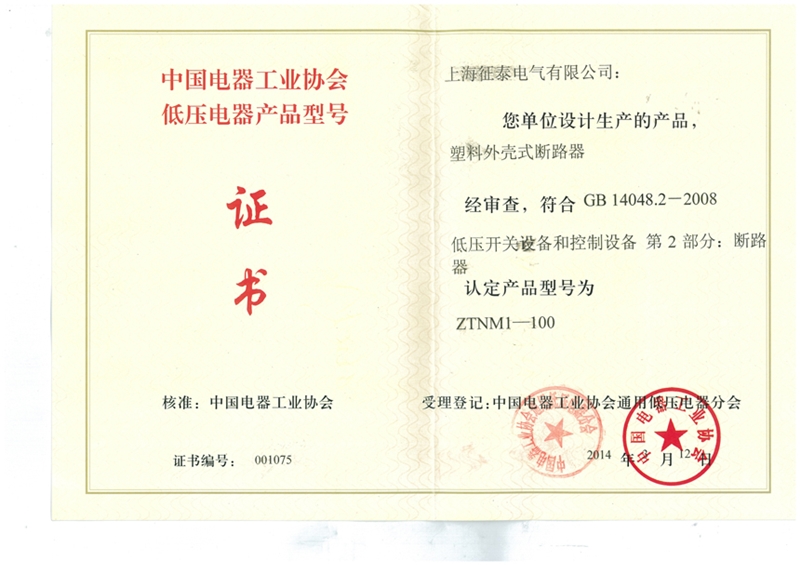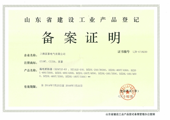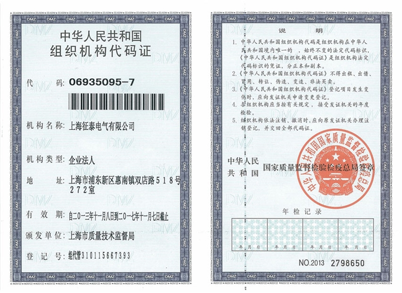 •     征泰电气企业代号证书